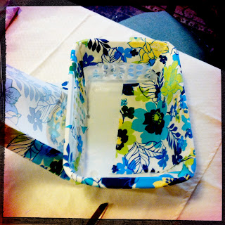 7. Depending on how much fabric you cut, you may need to fill in some areas on the inside. I cut a couple squares to fit over the ends of the insides of my bin, pre-folded and secured them with spray adhesive to give it a more polished look. I then sprayed it and placed over the exposed area.