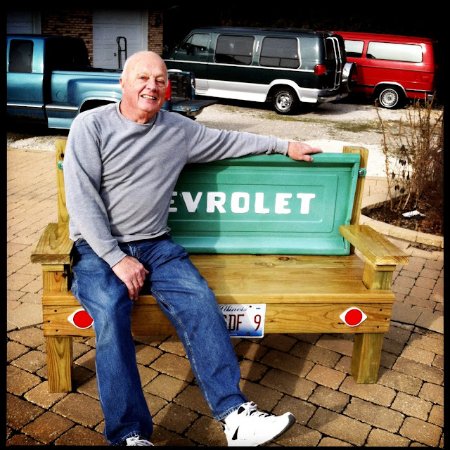 So in the coming days and weeks, I will be sharing the gifts we made this year. This first gift is one that we made for my grandpa. He had always wanted a 1955 Chevy truck. While I wish I could afford the whole truck, I instead ordered an original tailgate. We came up with a wooden bench for outside, that uses the tailgate as the backrest of the bench.