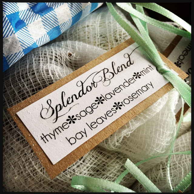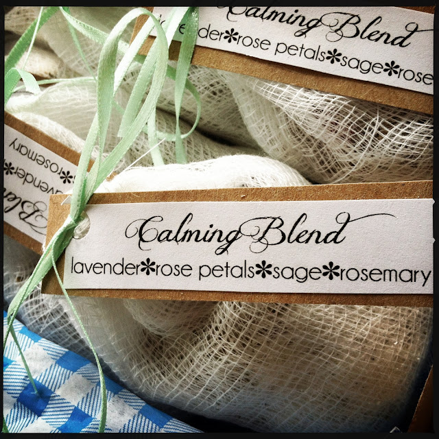 The next way of packaging was to give a box filled with a variety of pre-bagged mixes of the bath teas. I quickly sewed up some little drawstring bags out of cheesecloth and used pretty ribbon for the ties. You could use muslin, or organza as well, and I think you can find them pretty affordably at your local craft store if you don't want to make your own. I also whipped up some cute labels for each mix that I made to tie to the bags, and then one for the lid of the box. I’m one of those crazy people that LOVES wrapping presents, so I always take extra care when packaging something I made, it seems to make it a little bit more exciting to see what’s inside!
